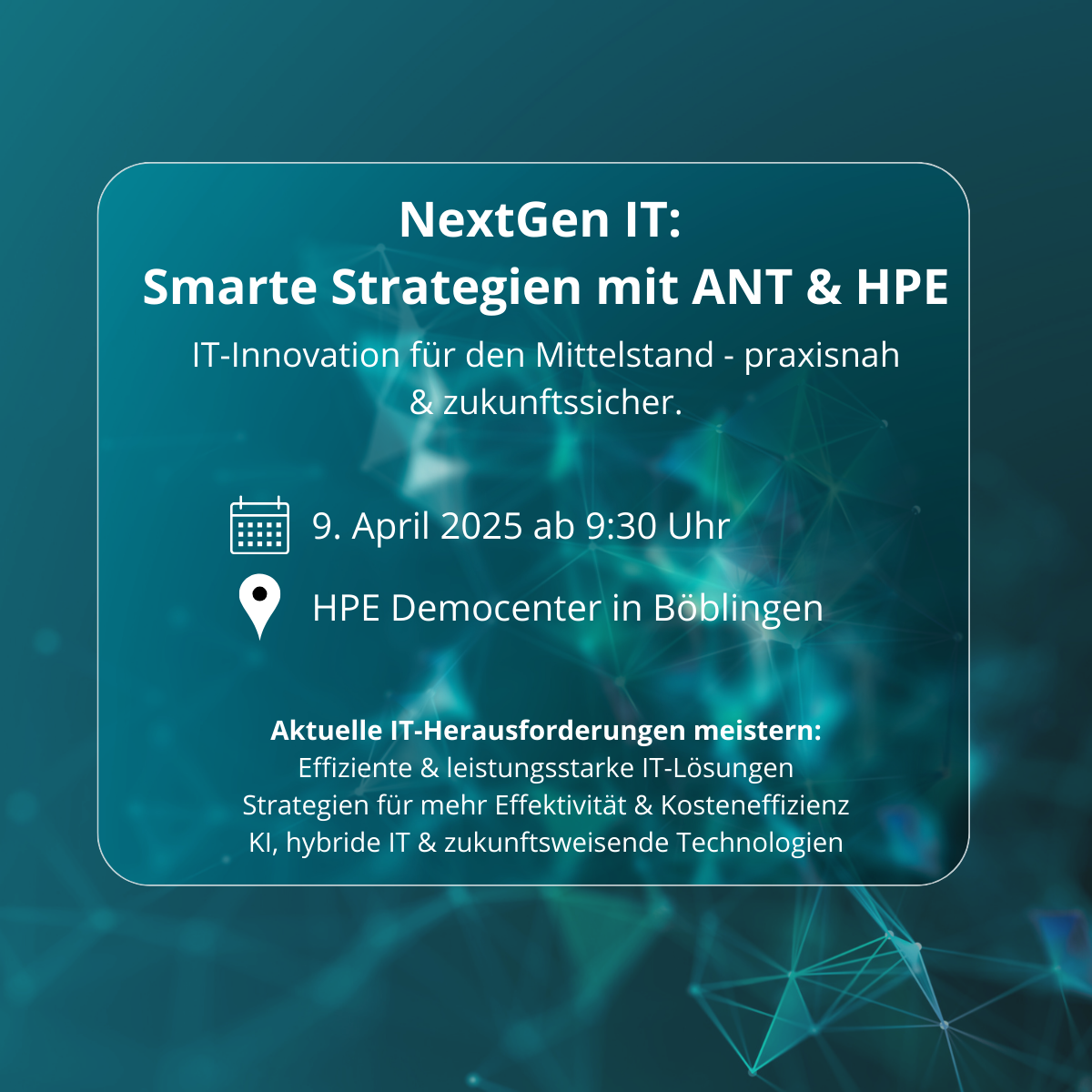 Wir begrüßen Sie recht herzlich am 9. April 2025 ab 9:30 Uhr im HPE Democenter in Böblingen - das sollten Sie nicht verpassen!